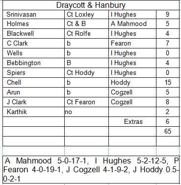 Scores: Draycott and Hanbury 65; Lichfield Nomads 66 for 3