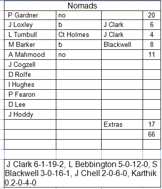 With a good batting line-up, Nomads were confident of achieving the low winning total. However the opening bowlers, Jack Clark and Luke Bebbington were having none of this. Clark, in particular, bowled at a good pace and troubled the batsmen. With no scoreboard pressure Pete Gardner and John Loxley were content to keep the bowlers out and tick the score along. Loxley was bowled by Clark and then Luke Turnbull was caught off Clark’s bowling. Pete Gardner was slowly accumulating and was joined by Matt Barker to push the score along. Barker was bowled playing across the line and Aneek Mahmood joined Gardner. In his brief innings Mahmood hit a six which helped to bring his season’s average to over 40. These two saw the innings out with the total being reached after 15 overs.