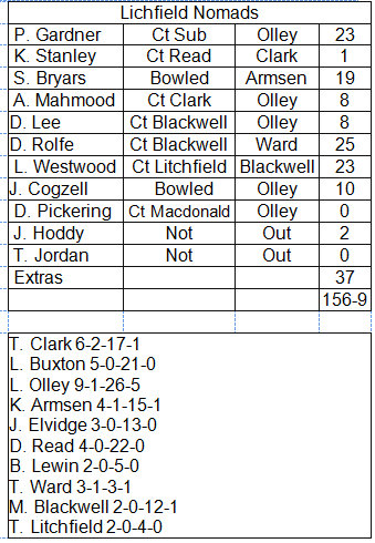 Toss: Lichfield Nomads won the toss and elected to bowl