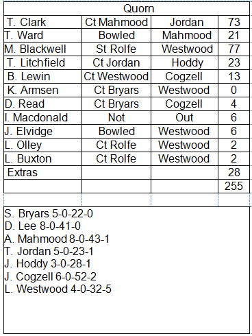 Scores: Quorn 255 all out, Lichfield Nomads 156 for 9